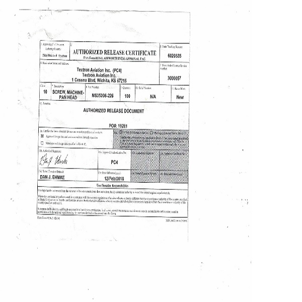 Aviation C of C only. Warranty: All parts are subject to your inspection. Return